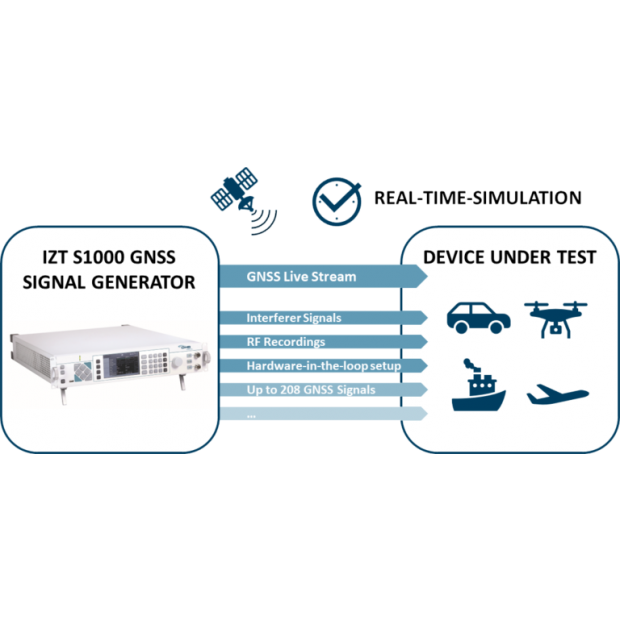 The OHB S1000 GNSS Signal Generator (left) supports real-time simulation of up to 208 GNSS signals and interference scenarios. It is ideal for applications in automobiles, drones, ships, and aircraft (right), providing comprehensive validation of navigation and timing performance.